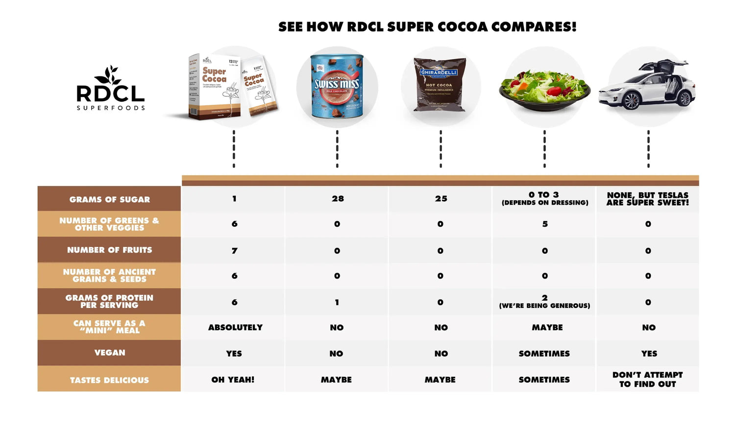 Unlike the 25+ grams of sugar per serving that you’ll find in many other cocoas, we don't add ANY sugar. All you’ll find is one measly gram of naturally occurring sugar, which comes from our fruits and oats.