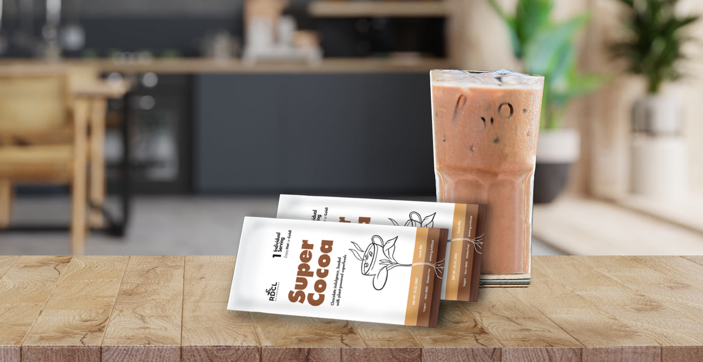 Shake Super Cocoa in a bottle or jar with unsweetened plant-based milk (or water) and a bit of ice for a refreshing superfood chocolate drink! You can also blend it with a banana or any other of your favorite "smoothie" ingredients.